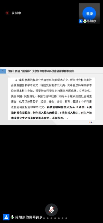 利用腾讯会议形式于线上举行了“挑战杯”大学生课外学术科技作赛启动仪式。启动仪式邀请了参赛经验丰富的陈旭康同学进行参赛经验宣讲培训,太阳城