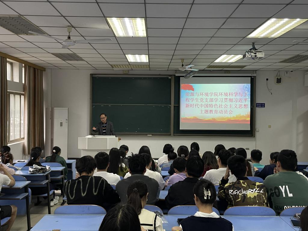 环境科学与工程学生党支部于教三北103教室举行了学习贯彻习近平新时代中国特色社会主义思想主题教育动员大会,支部全体党员参会。会议由支部书记黄乐远主持。