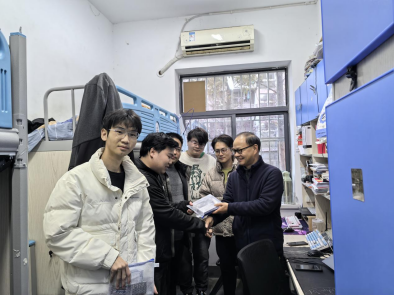 党委书记谢文平、副书记卫军帅、毕业班辅导员黄乐远一行共同走进考研学生宿舍,亲手为正在全力备考的考研学子送上精心准备定制的“考研加油包”。