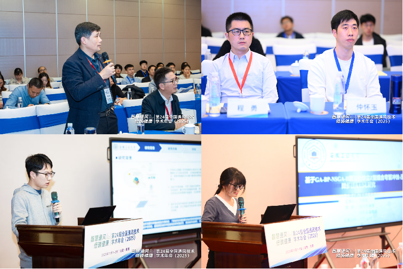 会议期间钱付平教授受邀担任“特殊环境通风与空气净化”分会场主持人,仲怀玉老师受邀在“工业通风与除尘2”分会场做了题为“泵式通风脉动换气与污染物非稳态运输机制研究”的主旨报告,硕士生桂江南、尹辉宏分别在“通风与热舒适、热环境”与“AI赋能通风及通风其他新技术”分会场做了题为“光伏系统与城市热环境的相互影响综述研究”和“基于GA-BP-NSGA-Ⅱ算法除尘Z型组合弯管冲蚀-压降多目标优化研究”的学术报告。