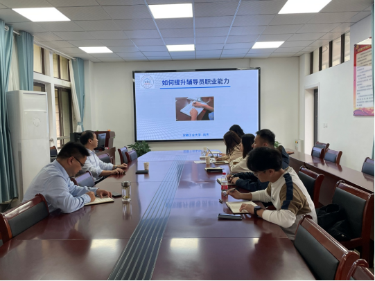 组织召开辅导员素质能力提升专题培训报告会。全体辅导员参会,凤杰老师以“如何提升辅导员职业能力”为题作了专题培训,院党委副书记、副院长卫军帅主持会议。