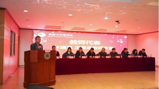 校先进班集体代表、能源与动力工程212班的查旭东同学就如何建设先进班集体、班级的管理制度建设、所取得的工作成效及对未来的展望发表了自己的见解。先进个人代表、环境工程201班保研湖南大学的宋慈同学上台分享了自己三年的学习成长历程,综合成绩第一、科创竞赛夺佳绩、社会实践展担当,用实际行动践行“有志者事竟成”。安徽省科技进步一等奖获得者、优秀教师代表环境系王育来老师总结了这一学年来所取得的成绩,展望了学院的未来发展,同时也对学生们进行了亲切勉励,希望同学们能成为一名为社会做出自身贡献的优秀大学生。